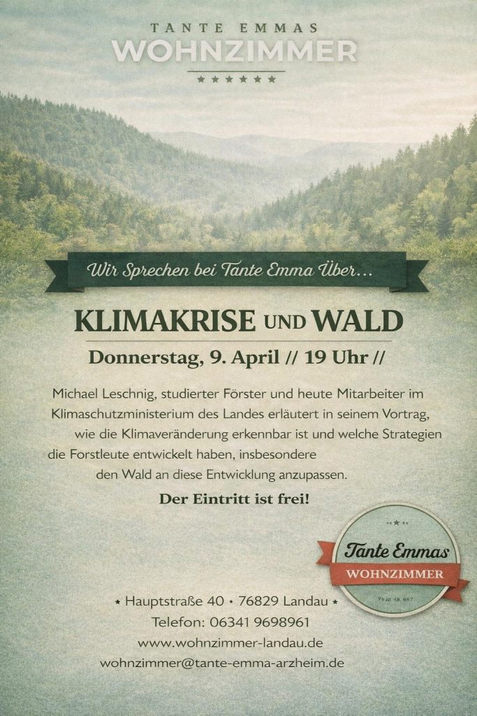 KLIMAKRISE UND WALD Donnerstag, 9. April // 19 Uhr // Michael Leschnig, studierter Förster und heute Mitarbeiter im Klimaschutzministerium des Landes erläutert in seinem Vortrag,…