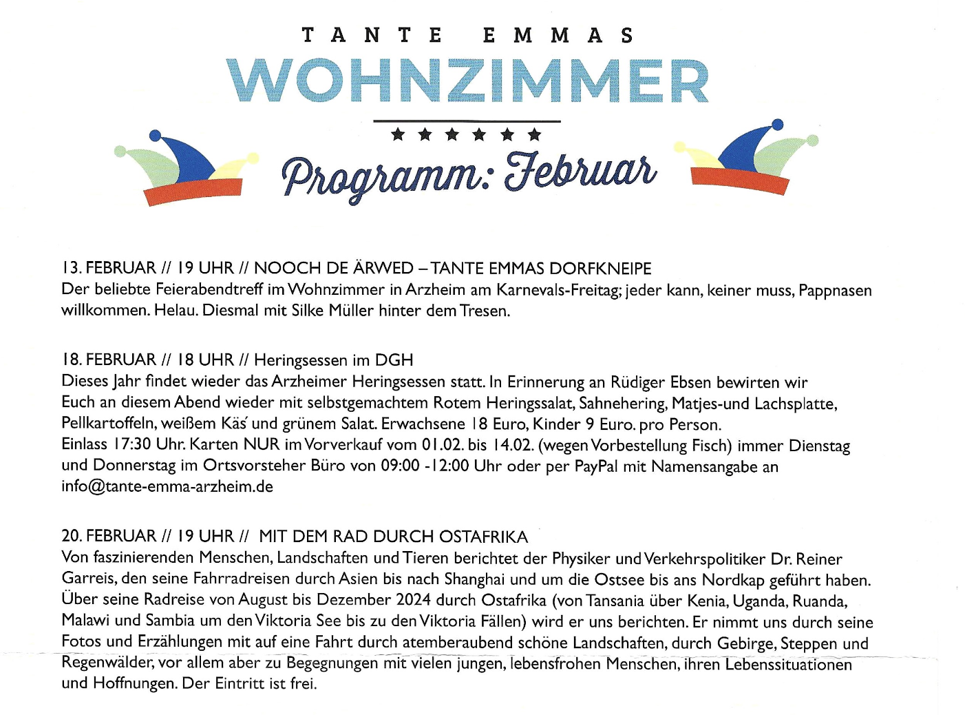 Einlass 17:30 Uhr. Karten NUR im Vorverkauf vom O 1.02. bis 14.02. (wegen Vorbestellung Fisch) immer Dienstag und Donnerstag im Ortsvorsteher Büro von 09:00 -12:00 Uhr oder per PayPal mit Namensangabe an