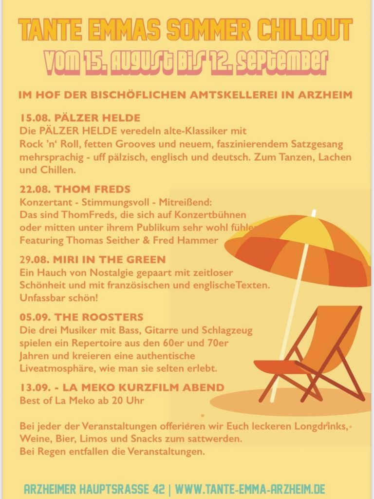 Das Wohnzimmer bietet einen Begegnungsraum mit regelmäßigen Veranstaltungen wie „Noch de Ärwed“, einem Feierabendtreff am Freitag sowie kleine Konzerte, Weinproben, dem Generationencafé, Kochabende, Dorfkino ….das aktuelle Monatsprogramm wird in unserem Flyer veröffentlicht, der in Arzheim verteilt wird. Ihr findet den Flyer mit dem aktuellen Programm auf der Startseite.